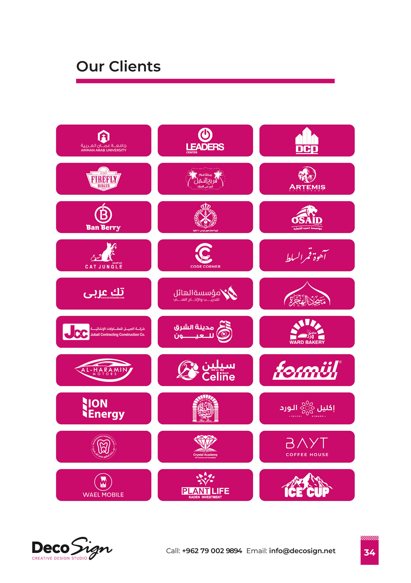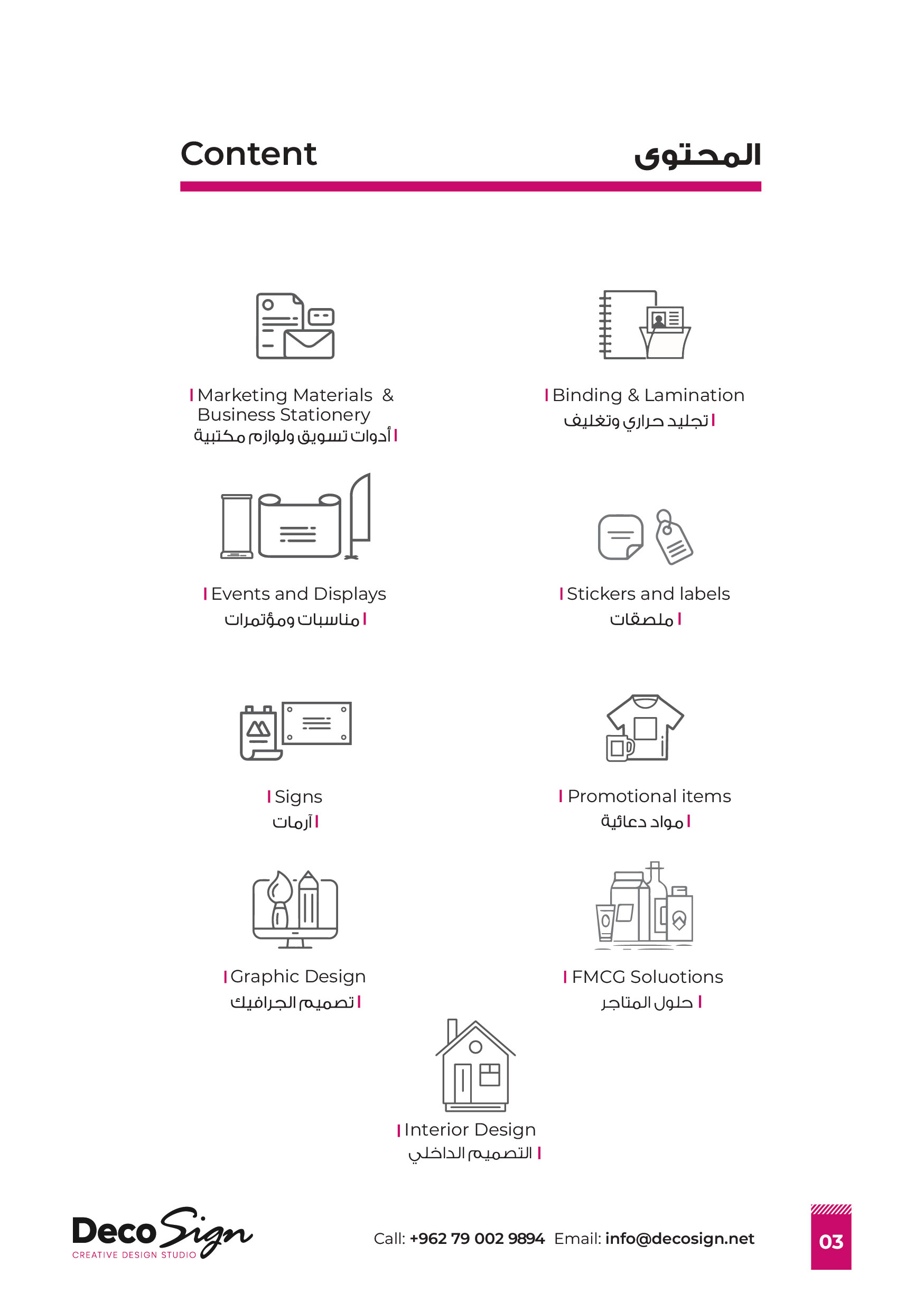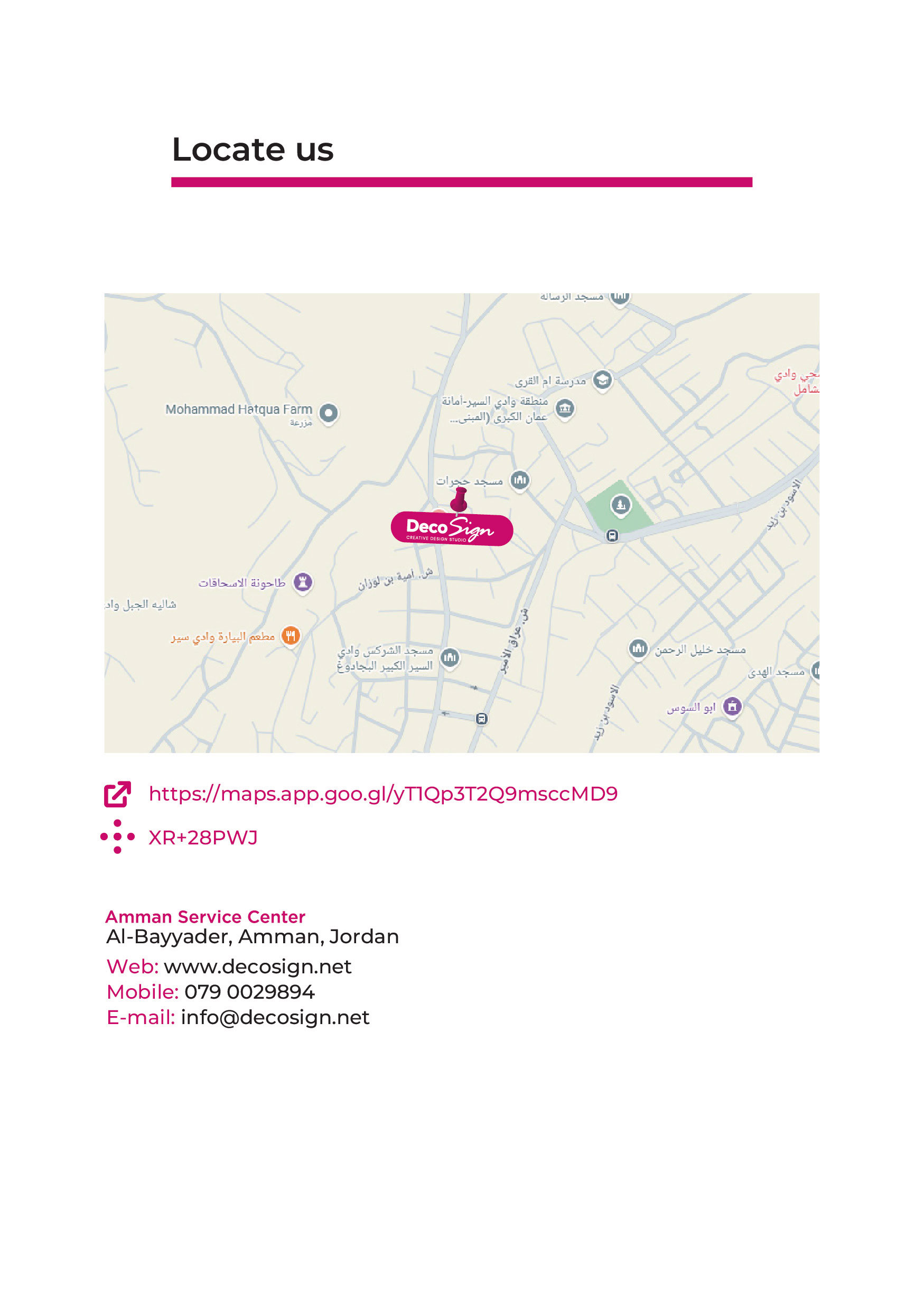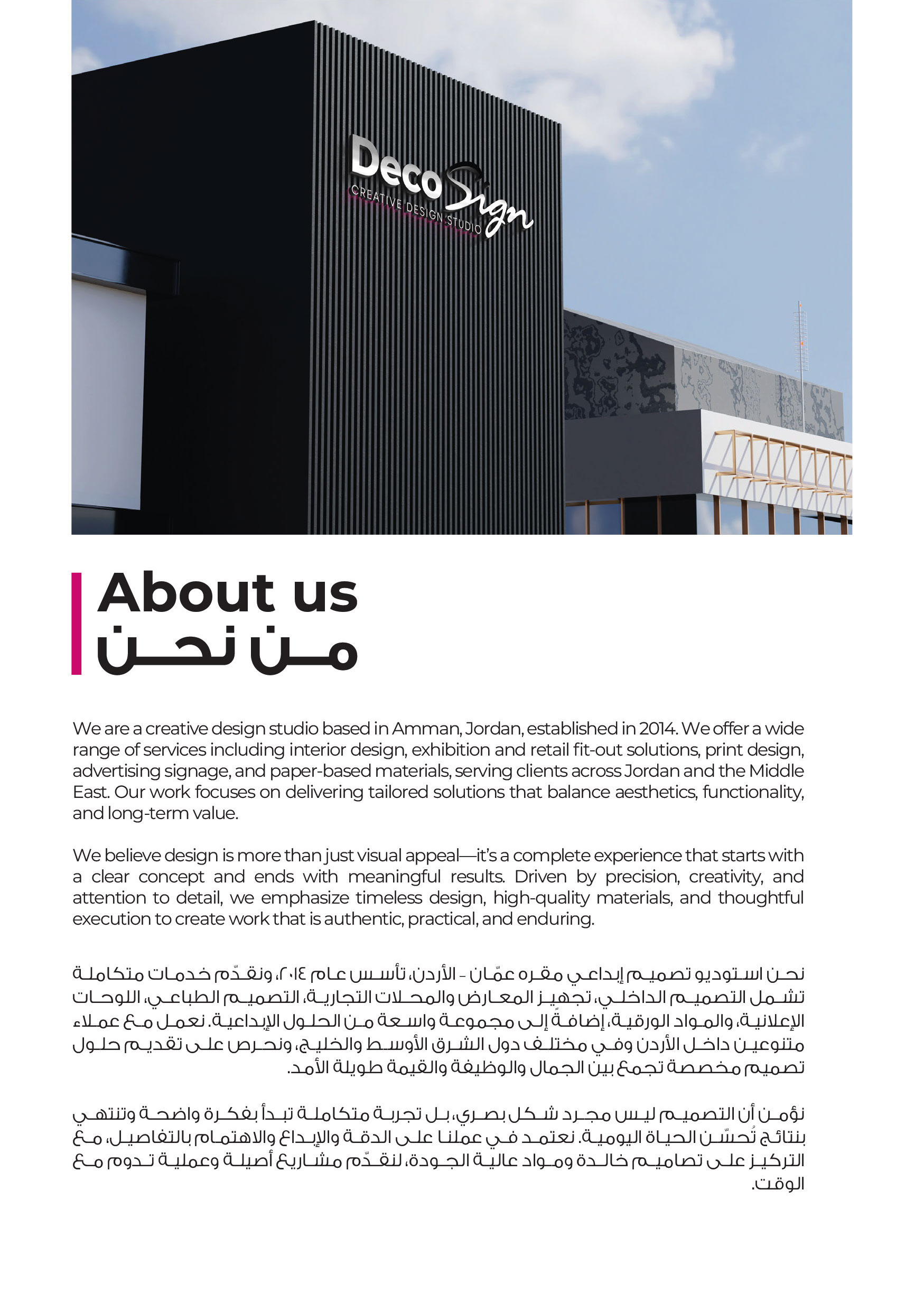 We are a creative design studio based in Amman, Jordan, established in 2014. We specialize in interior design, exhibition and retail fit-out solutions, print design, advertising signage, and paper-based printed materials, along with a wide range of creative design services.